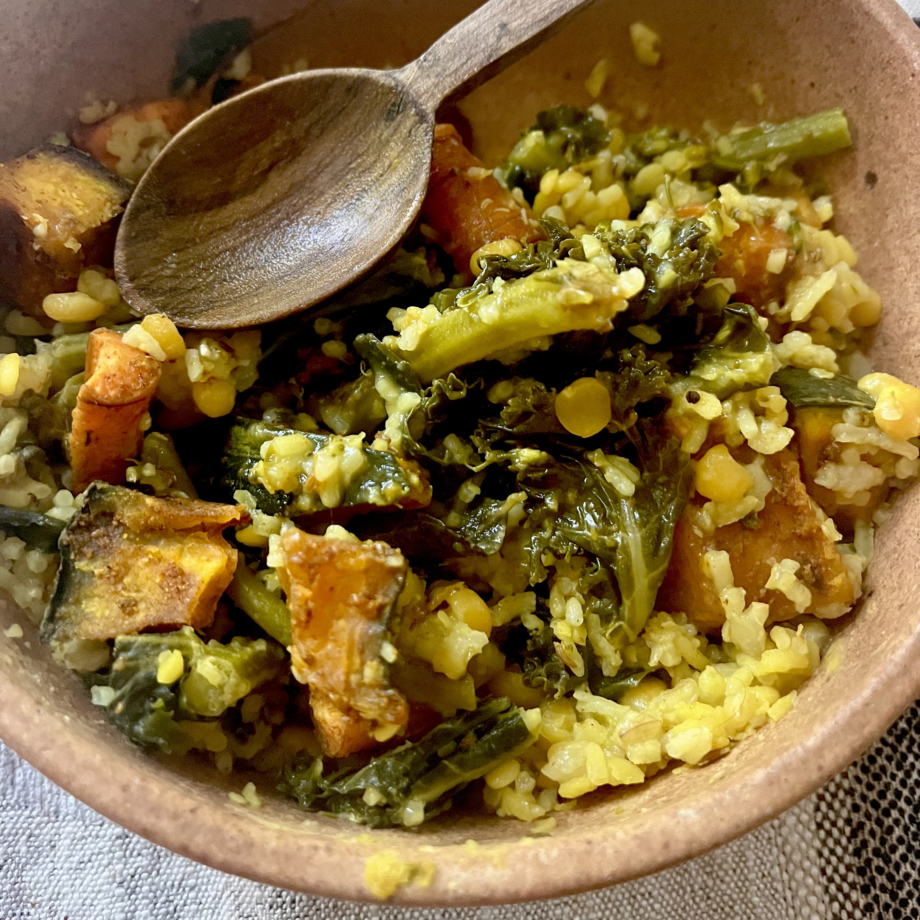 Before serving, stir in (2 tsp) coriander and (½ tsp) cardamom. Garnish with cilantro and squeeze of lemon (My favorite way to make this is with green beans and zucchini cooked in the Khichdi, and to put roasted Kabocha squash on top :)